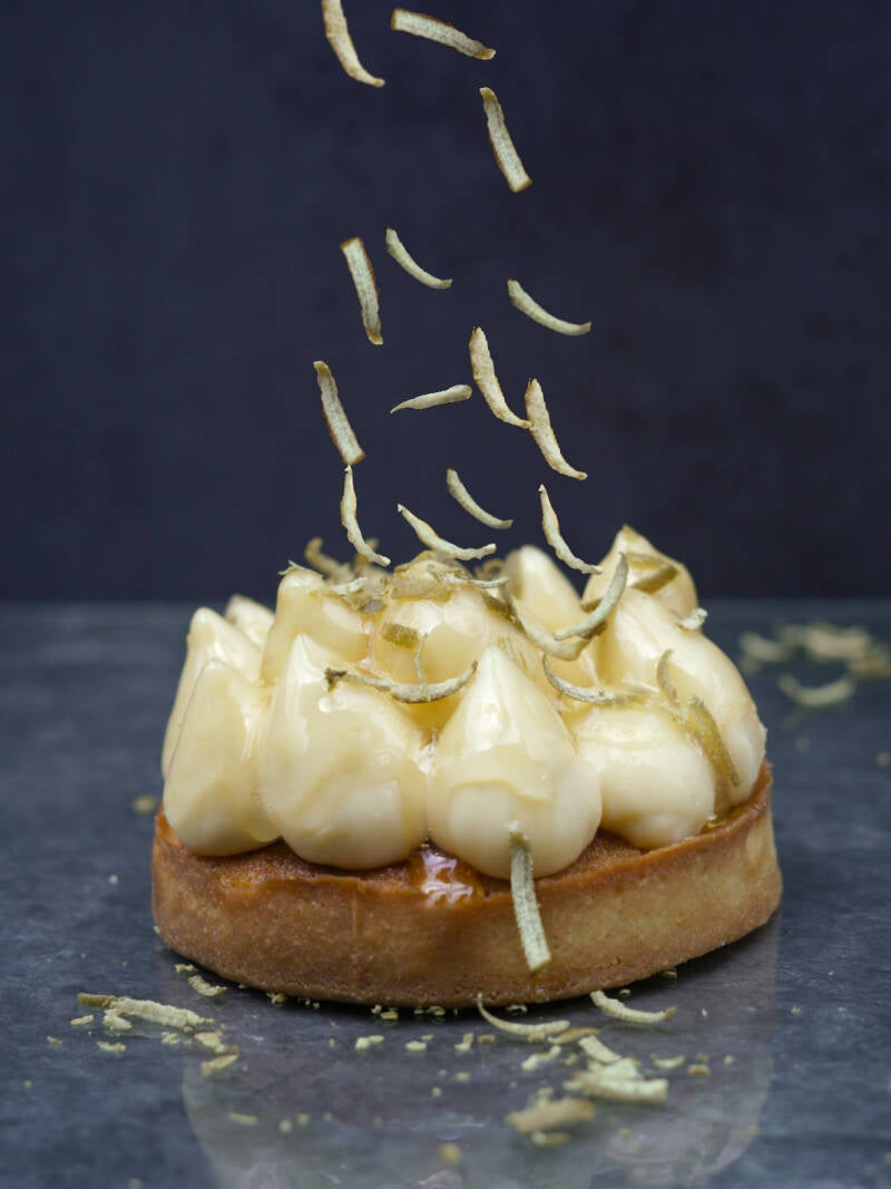 Biscuit coco, mousse mangue, insert fruits de la passion, glaçage exotique