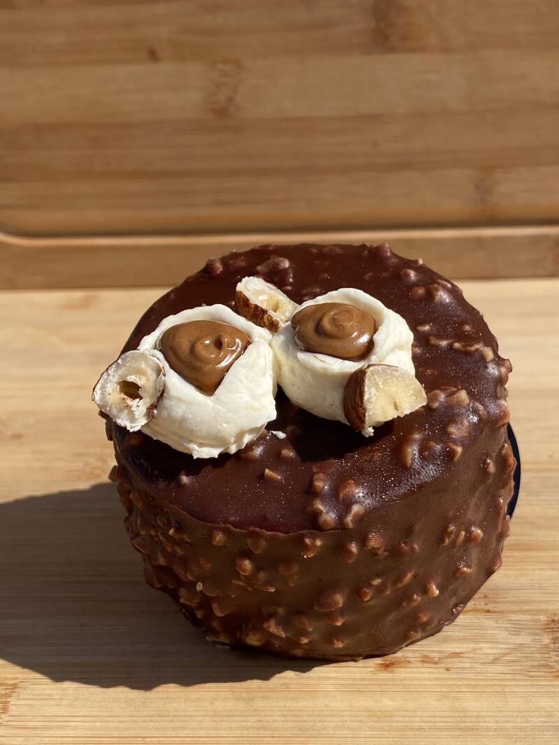 Croustillant noisette, insert caramel beurre-salé, glaçage noisette et mousse chocolat au lait